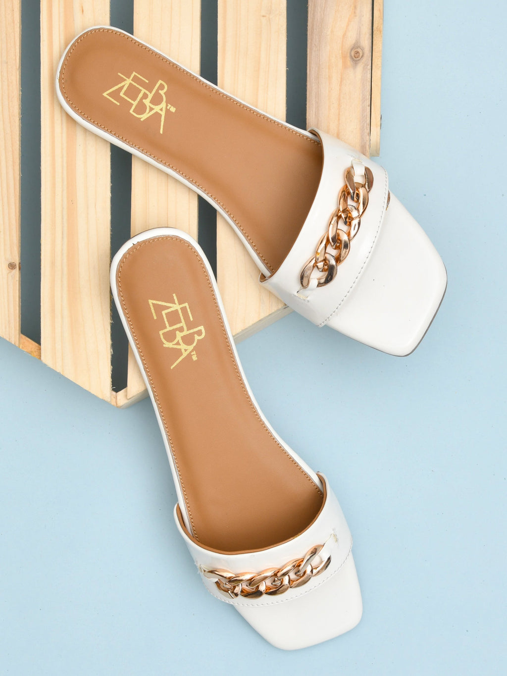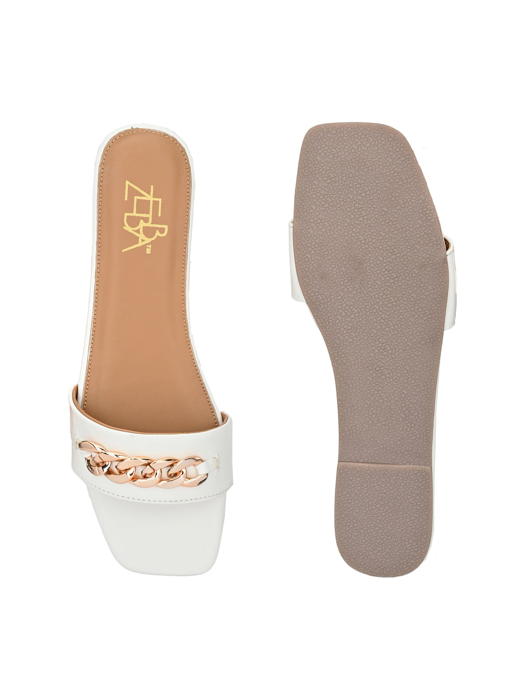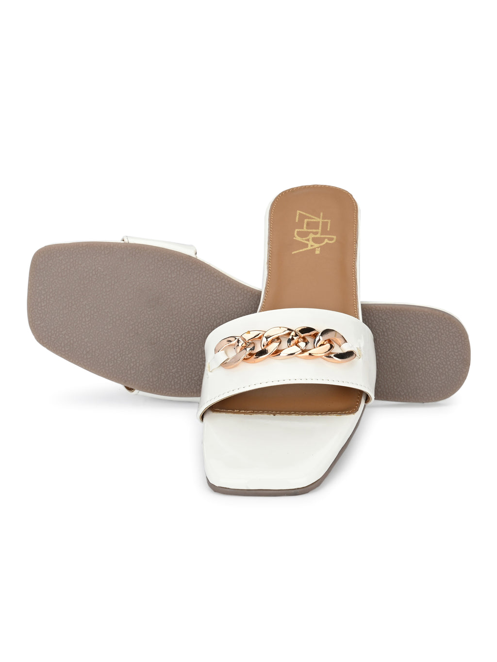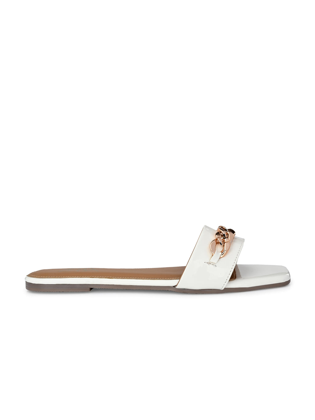 Square toe slides, Featuring a crisp ivory finish and a bold gold chain . Designed for both comfort and style, the cushioned tan footbed ensures all day wearability for any occassion.