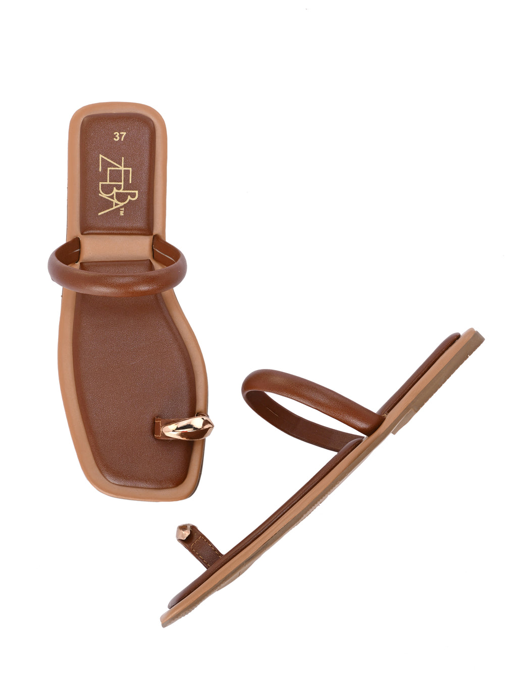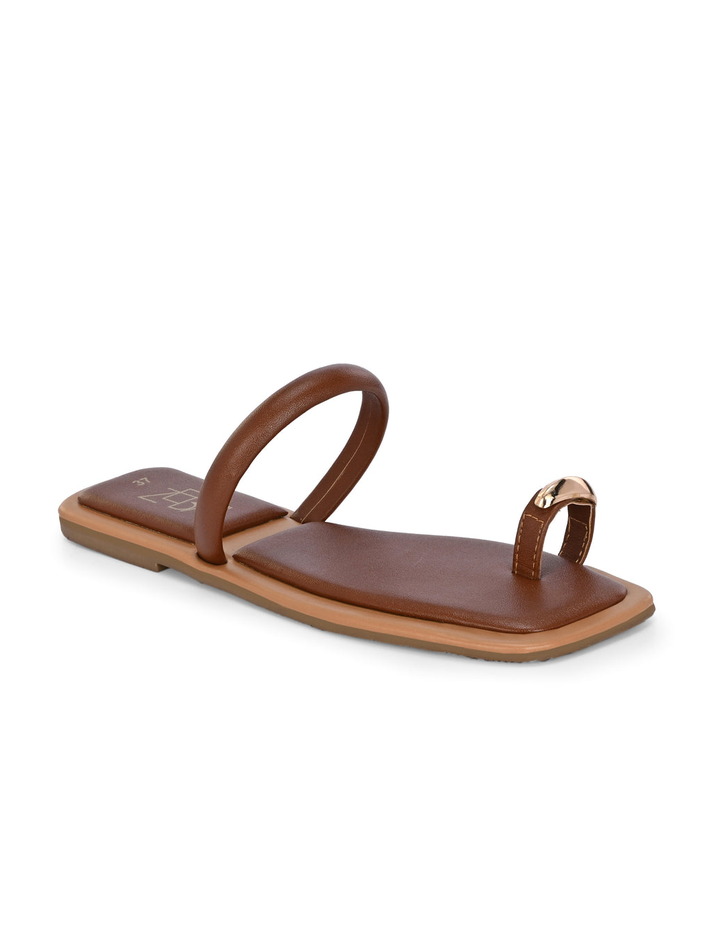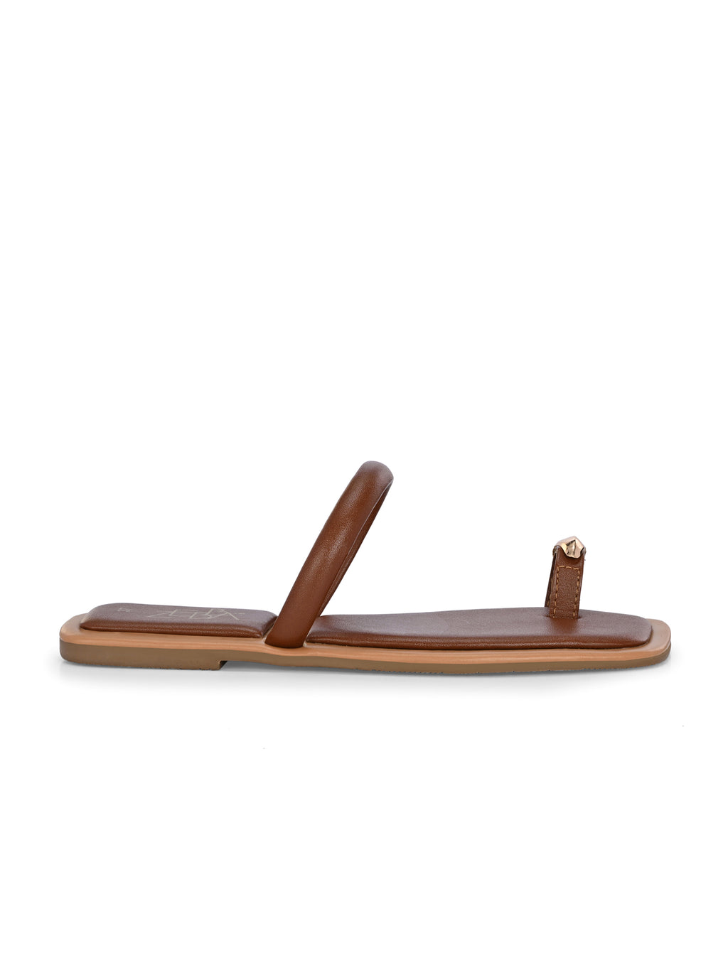 The product is a women's brown leather flat sandal. It is a simple toe-post and ankle strap design with a beige rubber sole. The sandal has a synthetic leather upper and a comfortable, lightweight flat base.