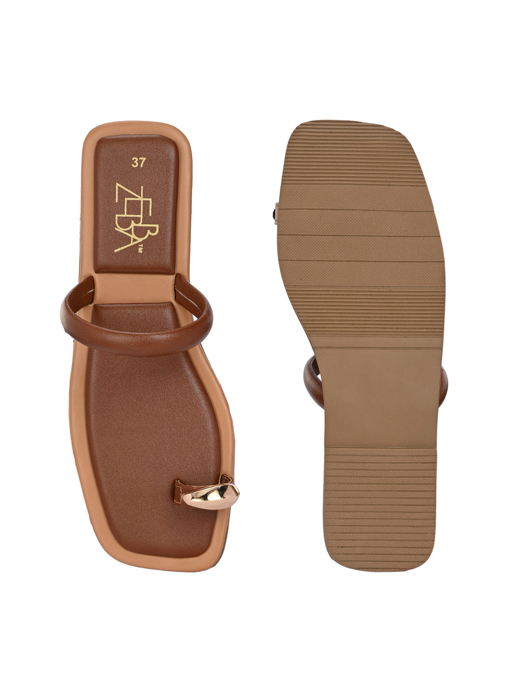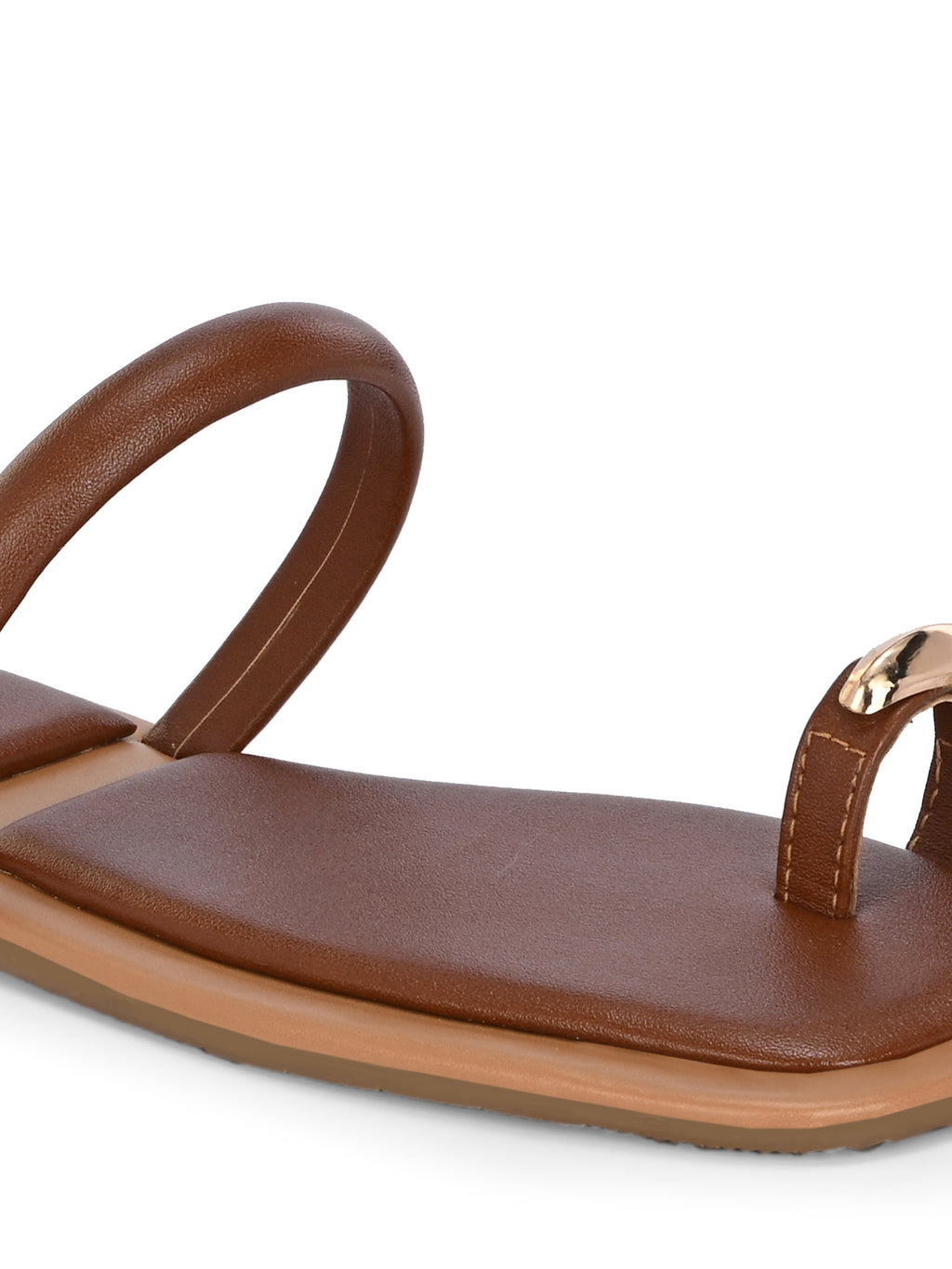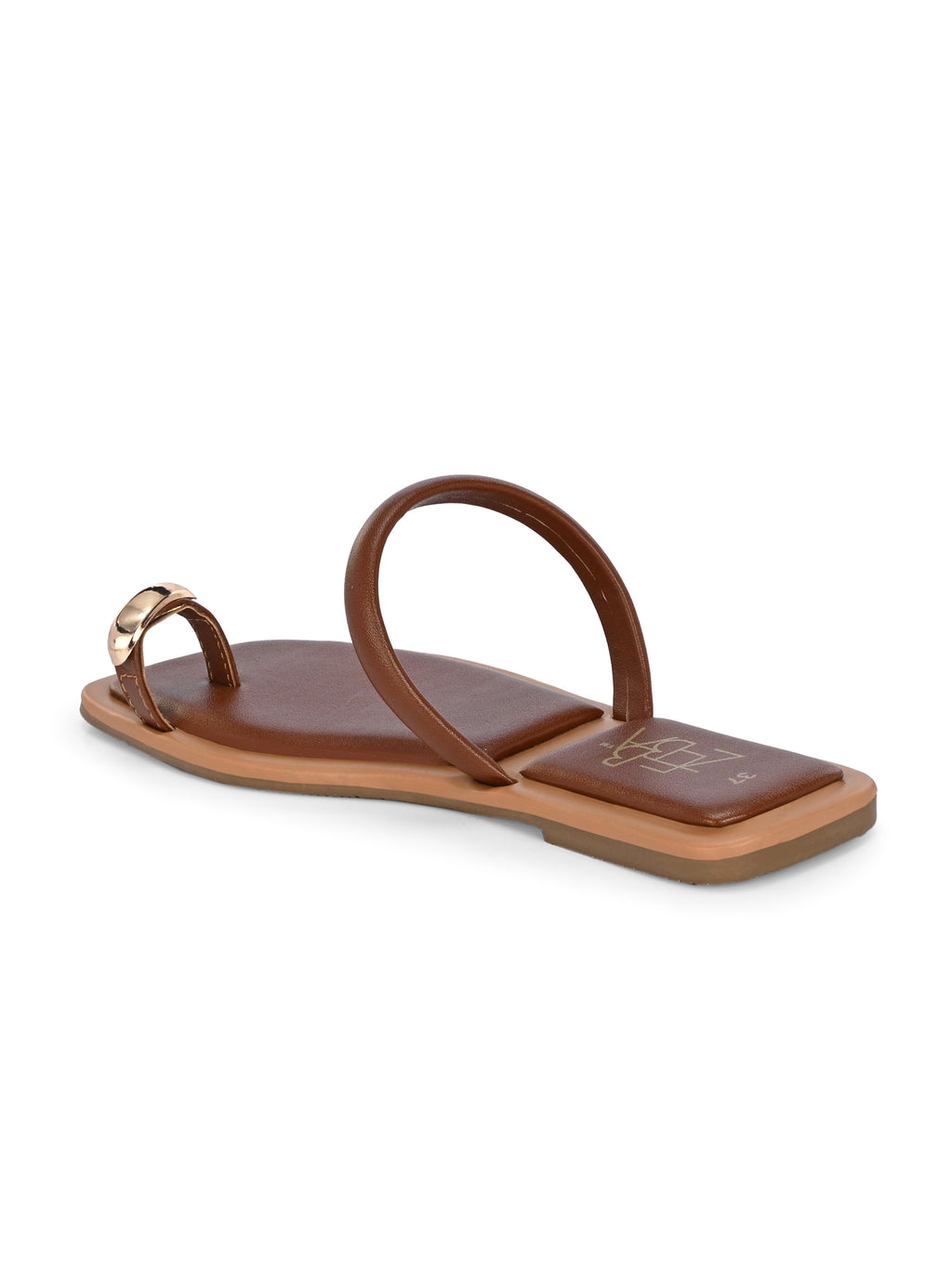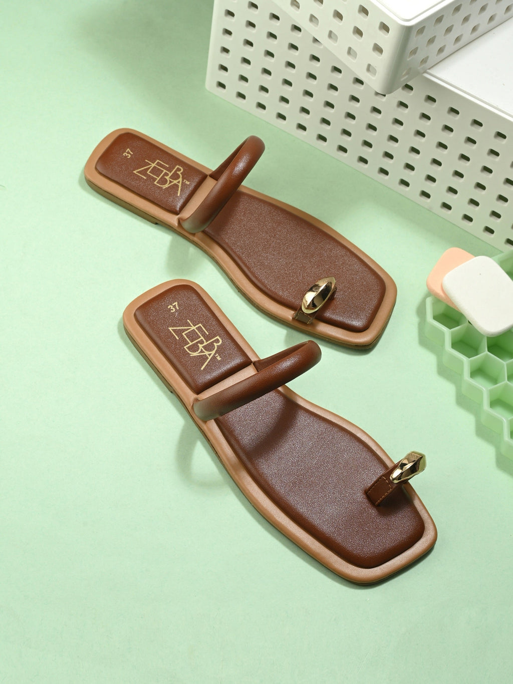 The product is a women's brown leather flat sandal. It is a simple toe-post and ankle strap design with a beige rubber sole. The sandal has a synthetic leather upper and a comfortable, lightweight flat base.