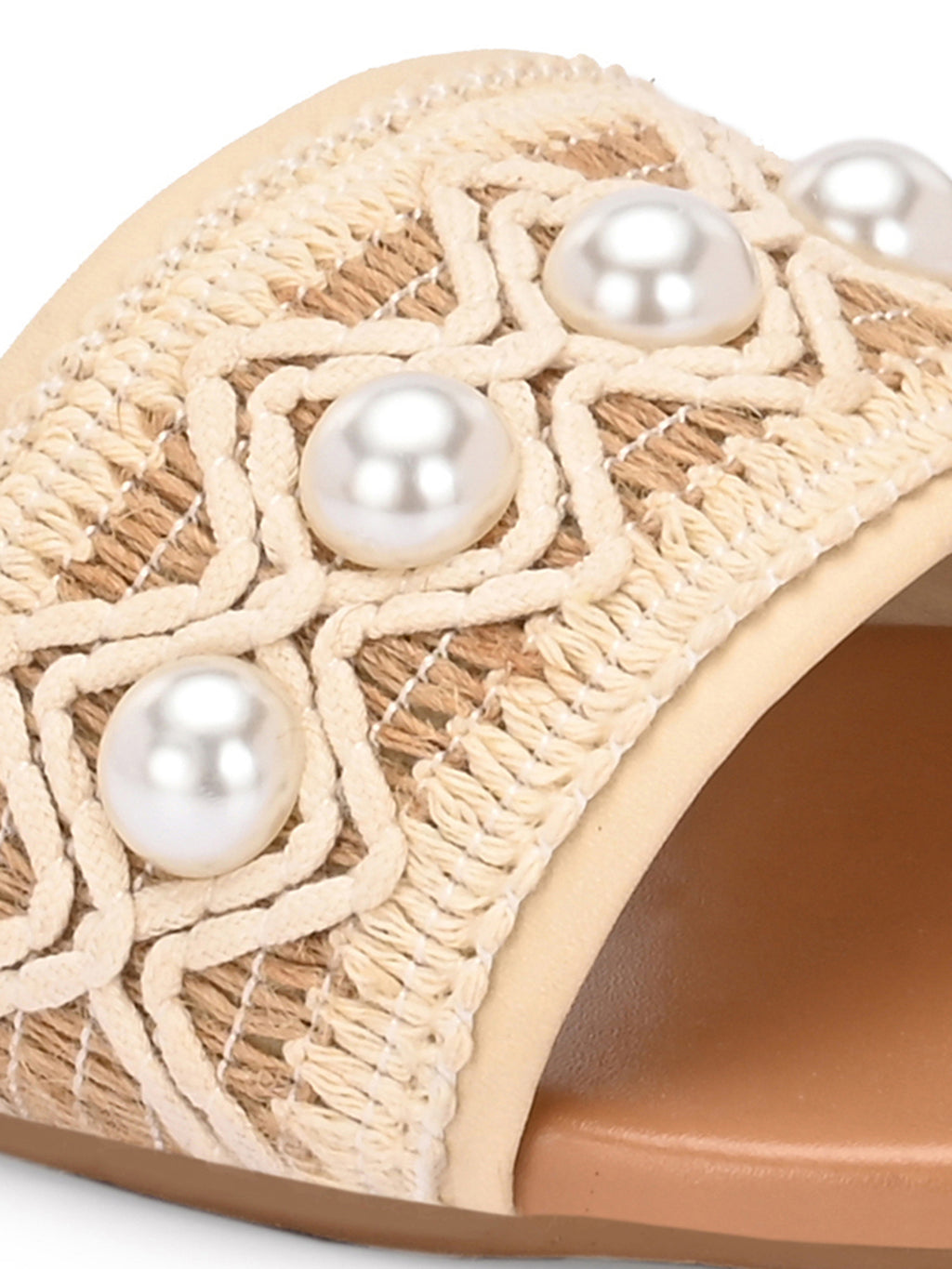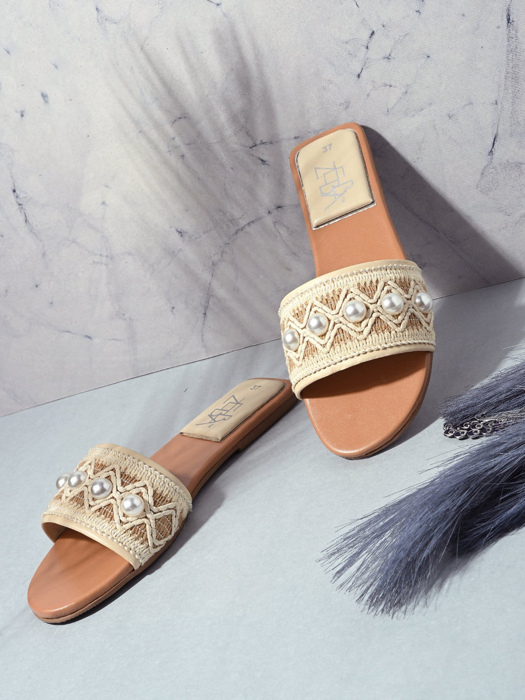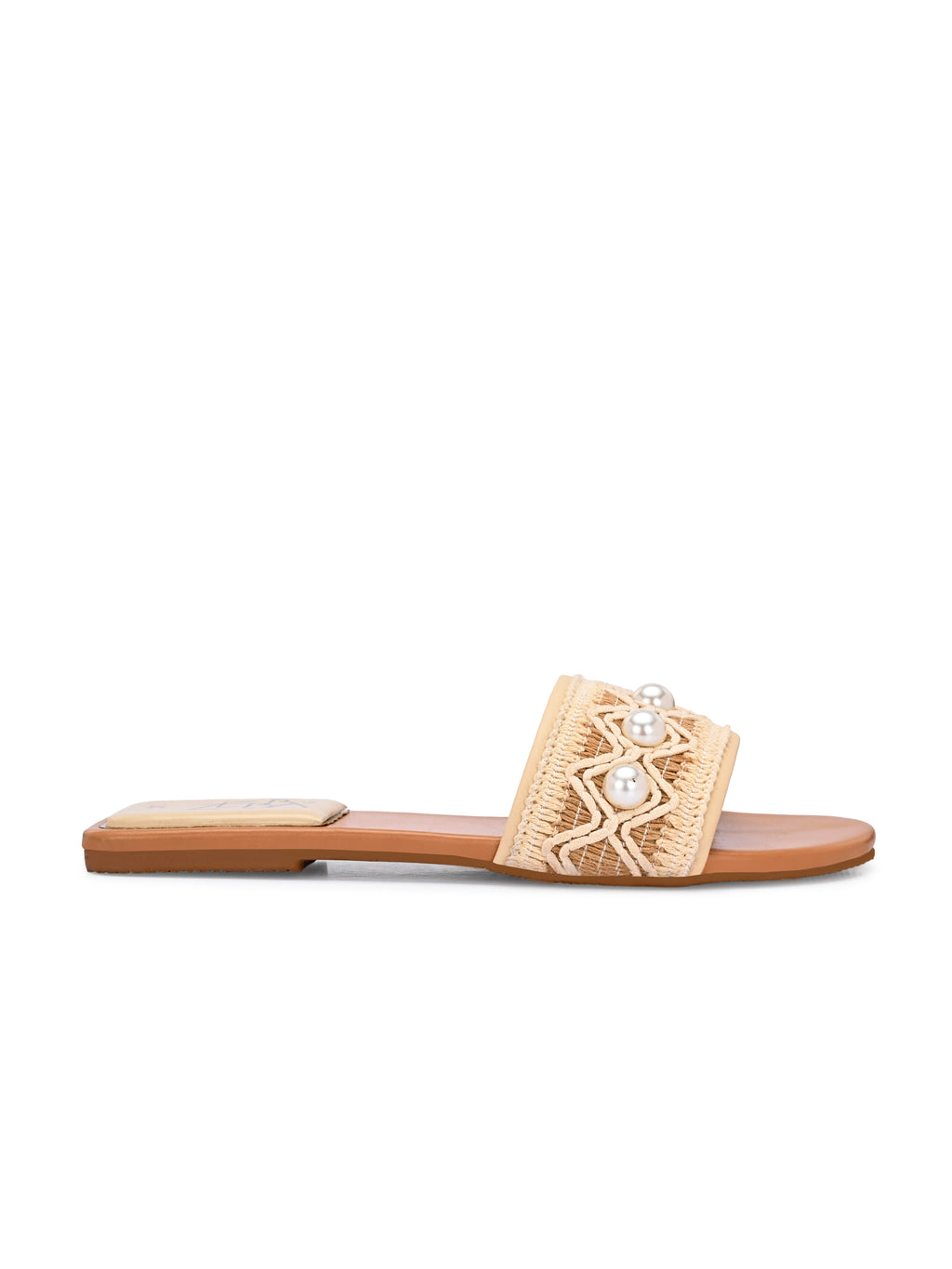 Pearl embellished Slides has a perfect blend of Boho-chic Vibe and classic Elegance. Designed with Neutral tan sole and a contrasting Logo patch, make them durable yet Fashionable..