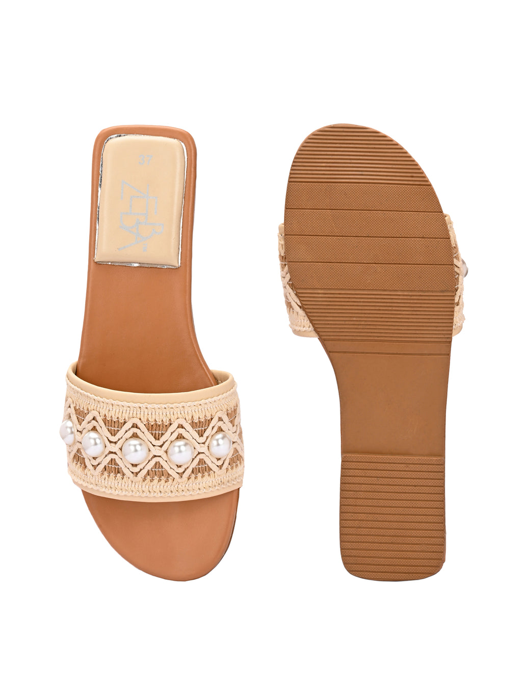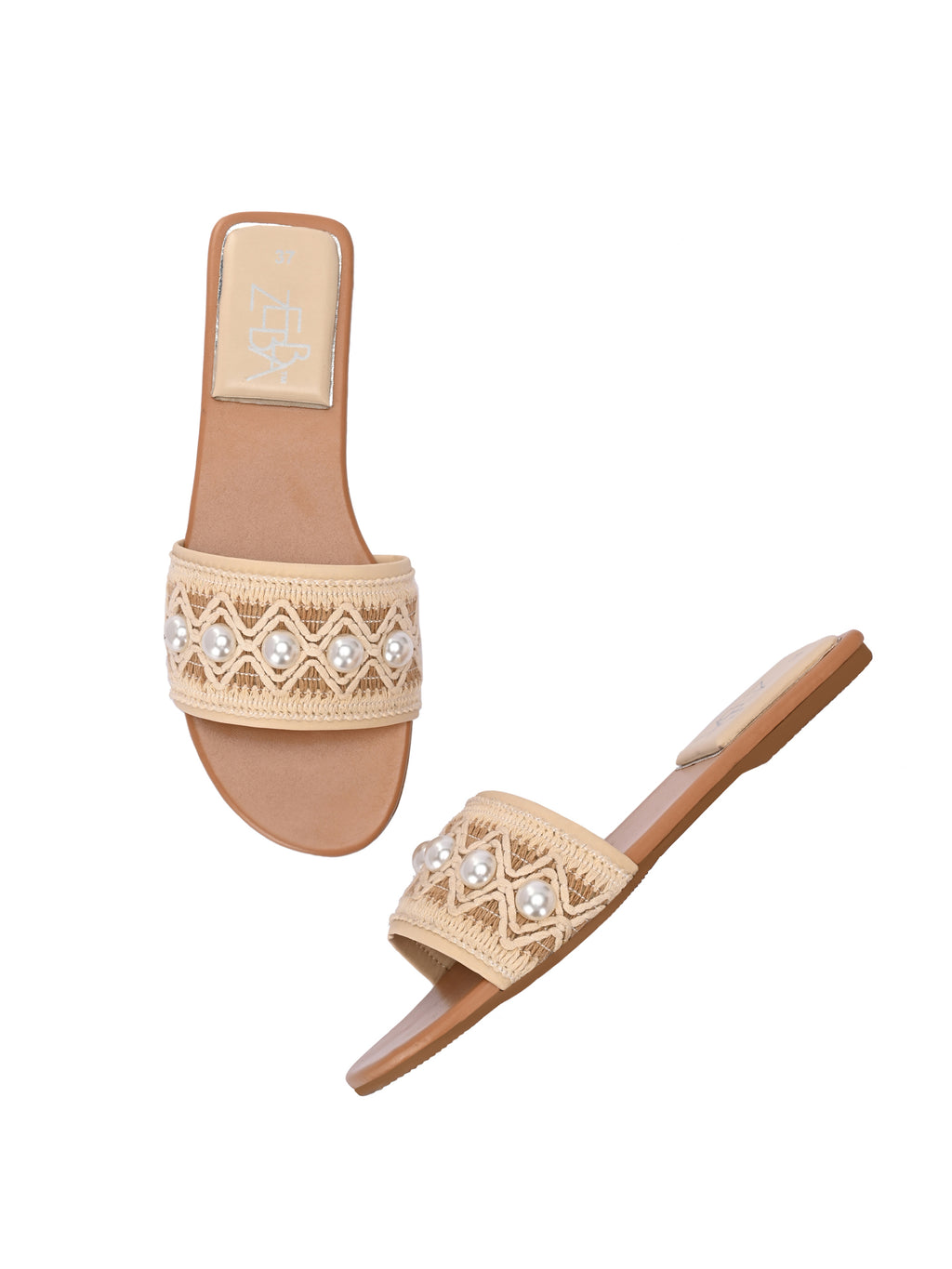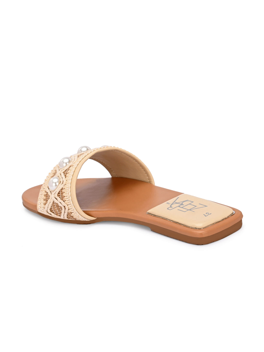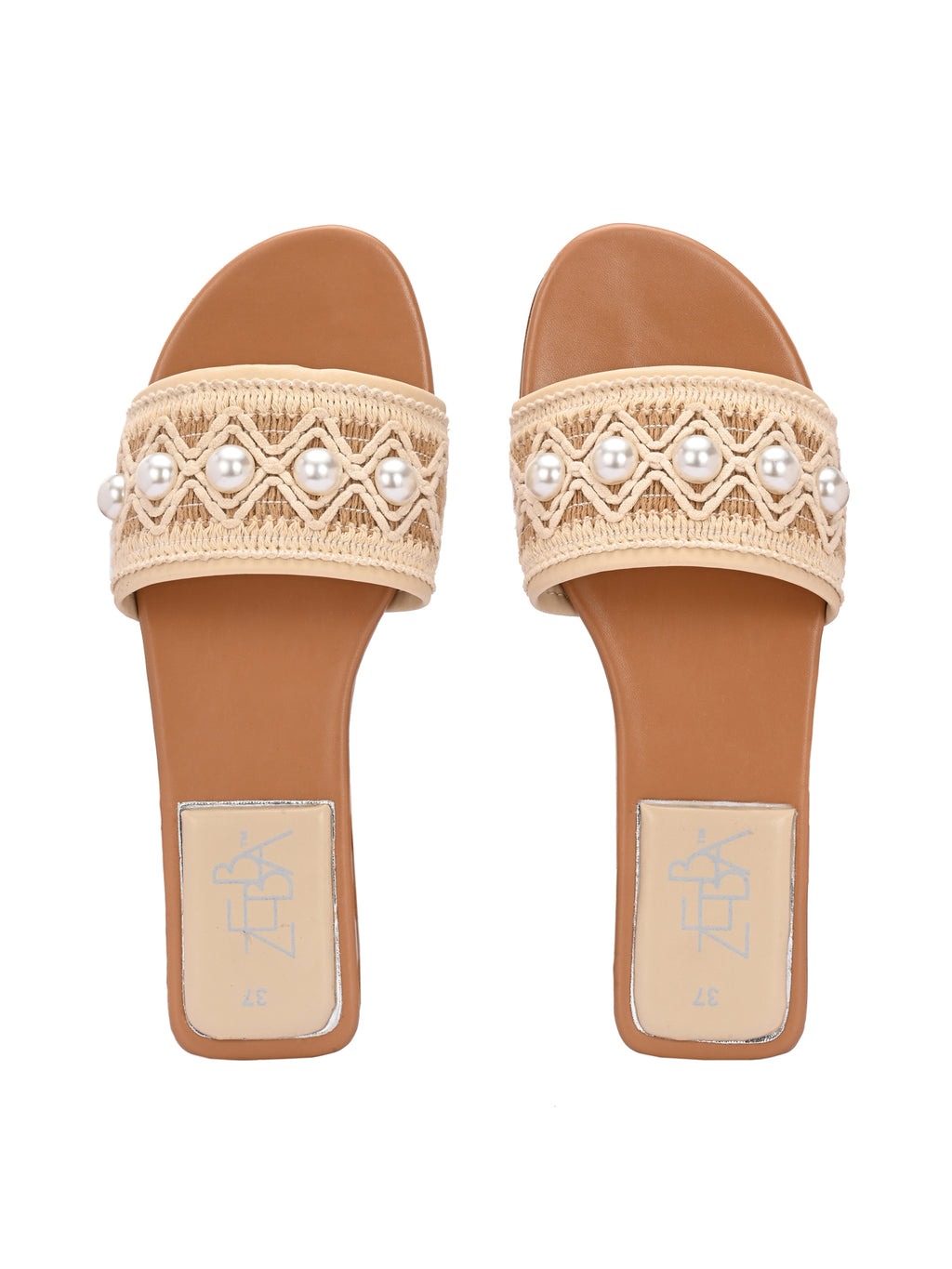 Pearl embellished Slides has a perfect blend of Boho-chic Vibe and classic Elegance. Designed with Neutral tan sole and a contrasting Logo patch, make them durable yet Fashionable..
