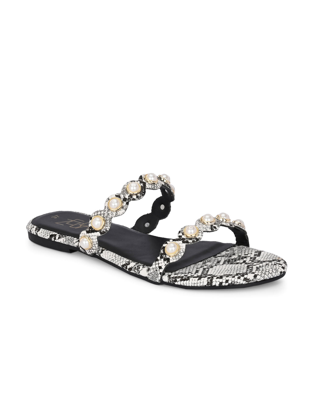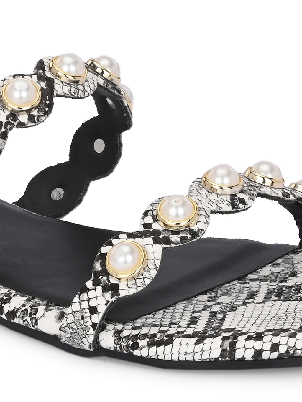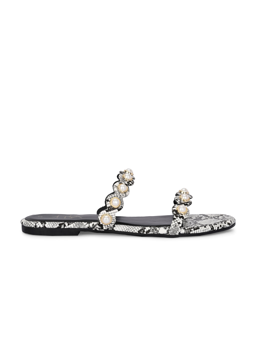 These stylish black pearl & rhinestone sandals with an ankle strap. The flat, textured sole adds a chic snakeskin finish for modern flair.