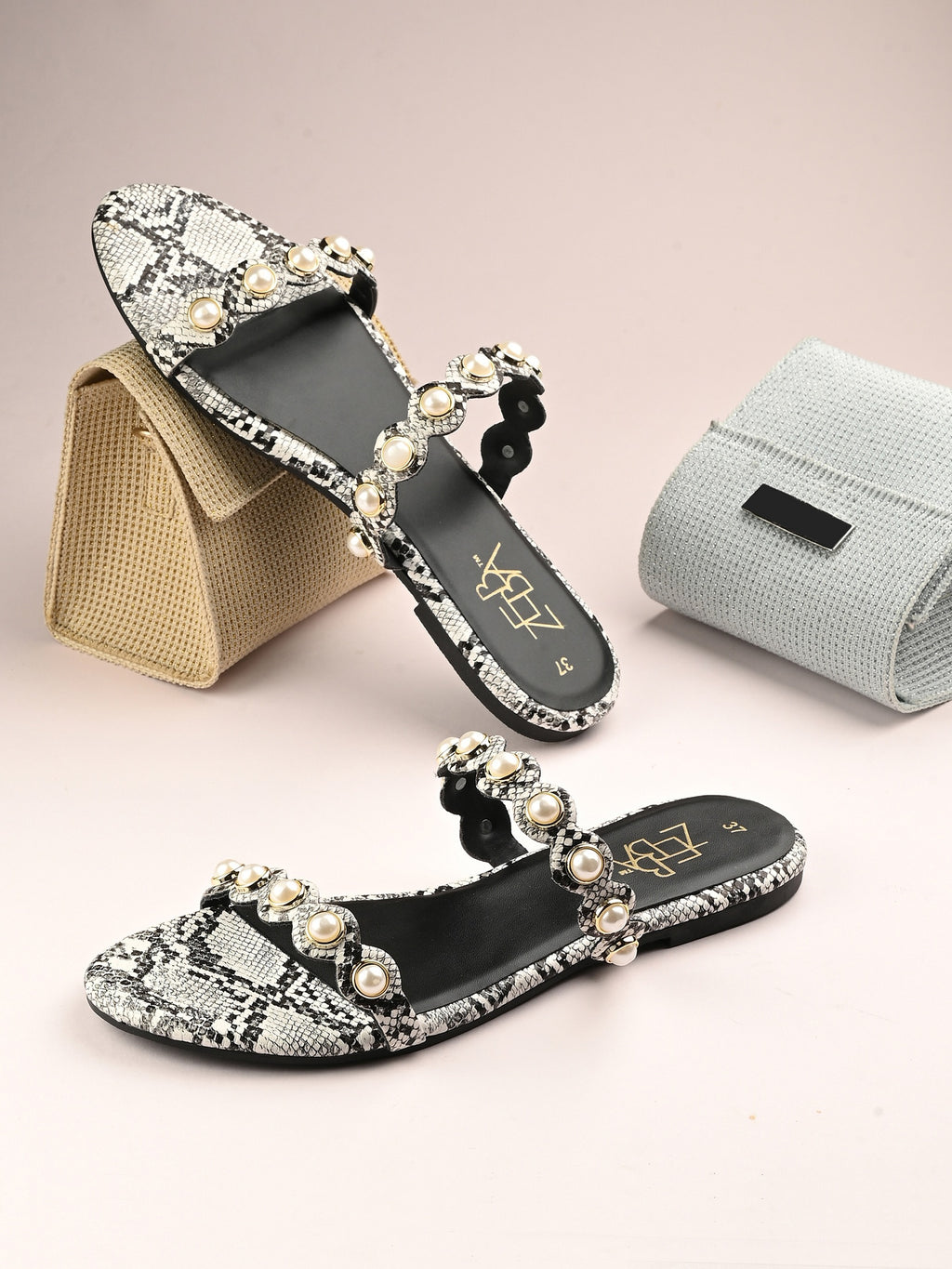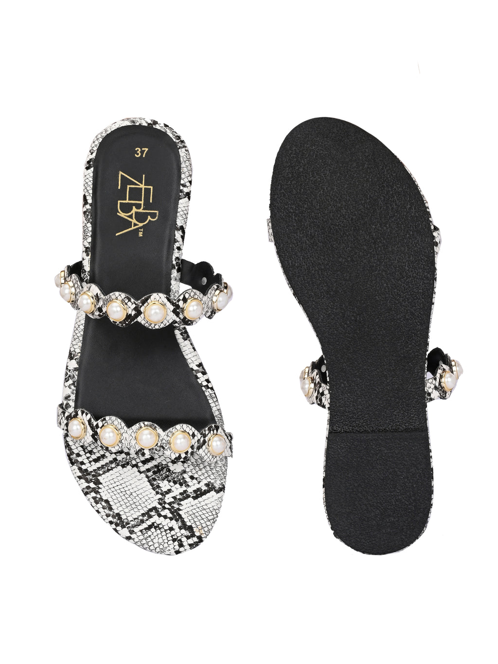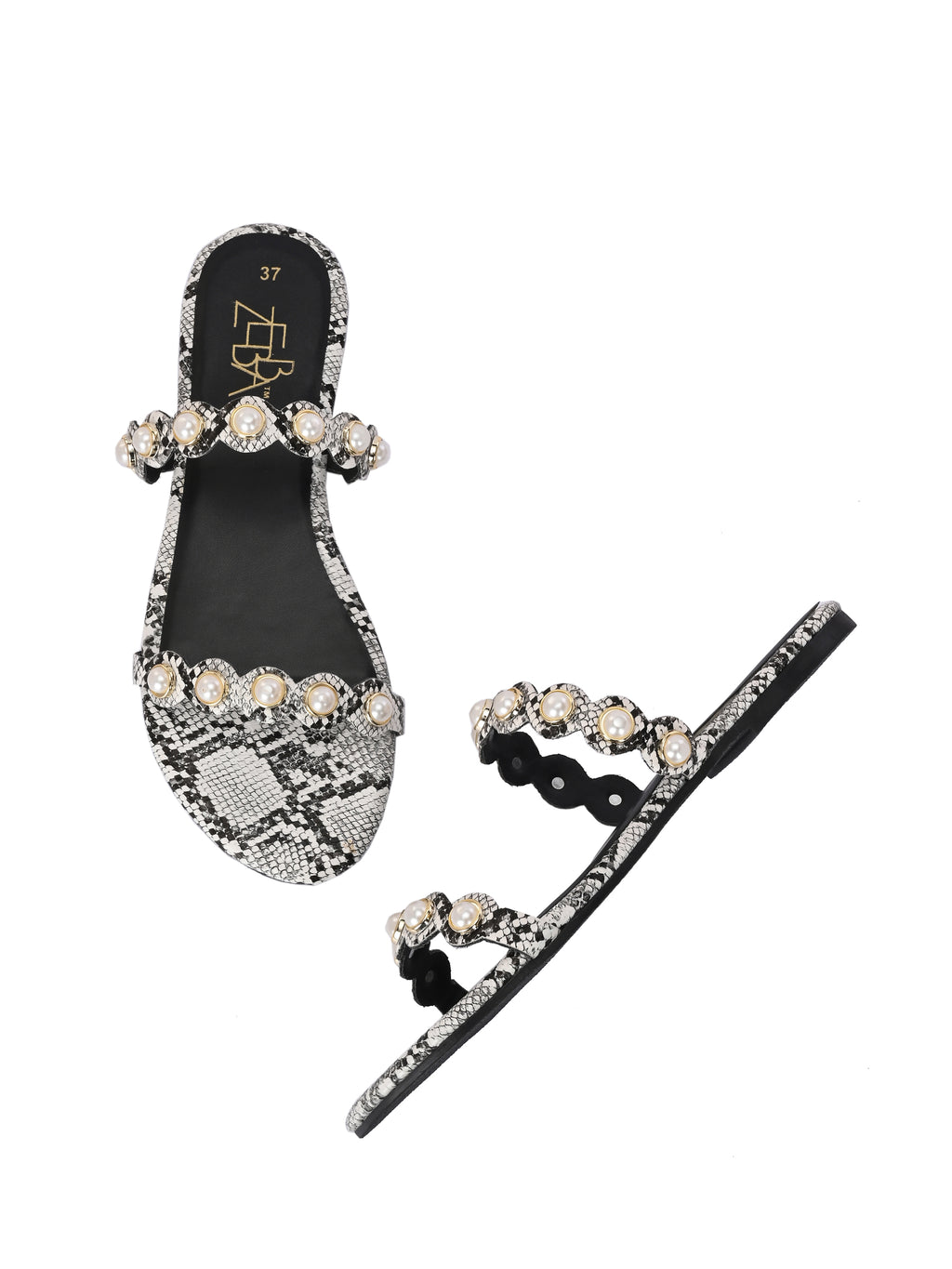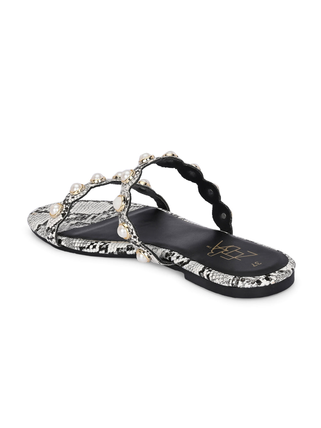 These stylish black pearl & rhinestone sandals with an ankle strap. The flat, textured sole adds a chic snakeskin finish for modern flair.