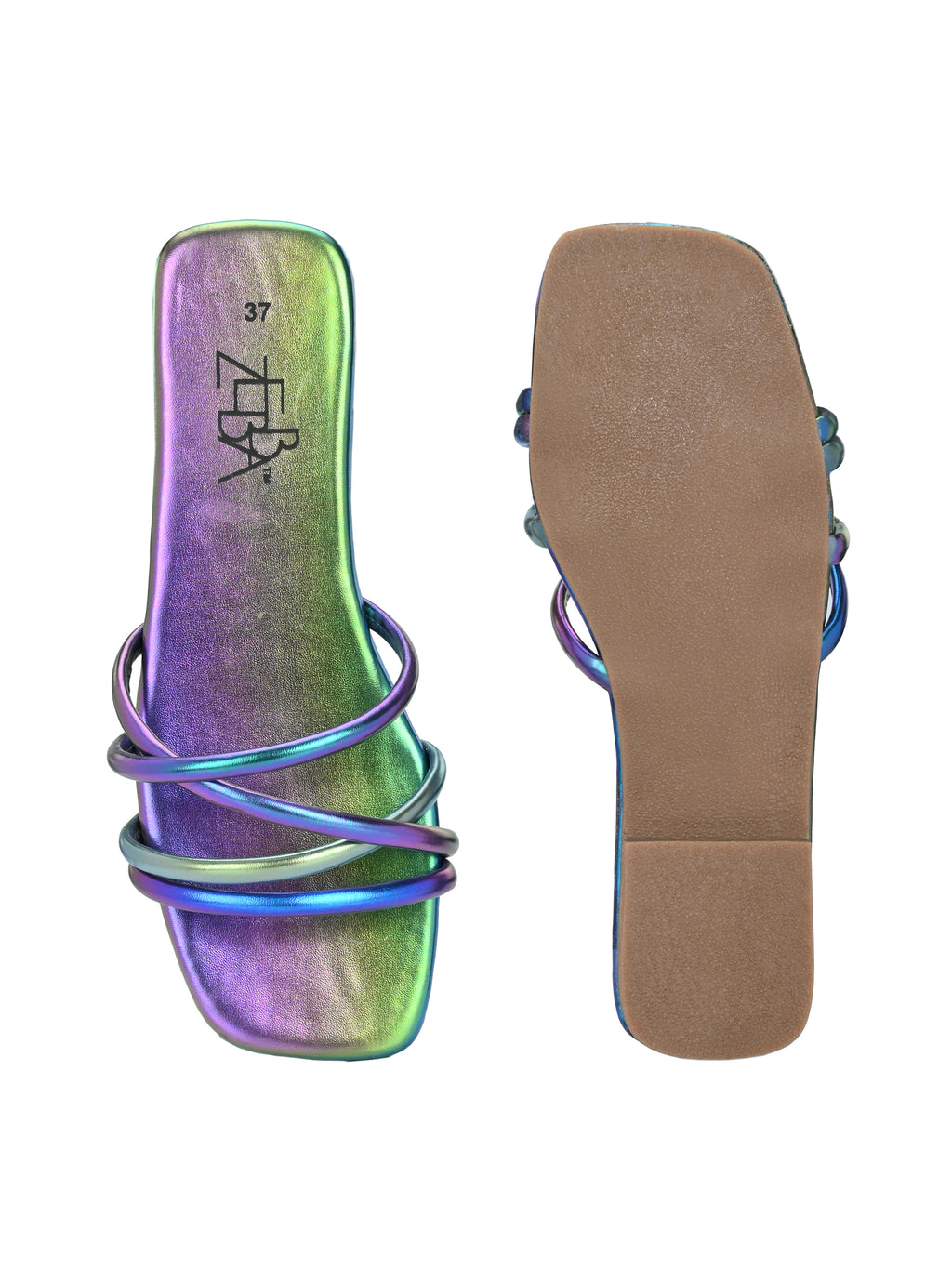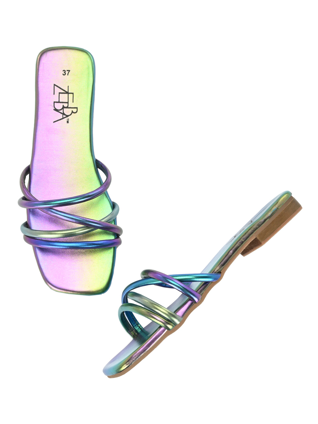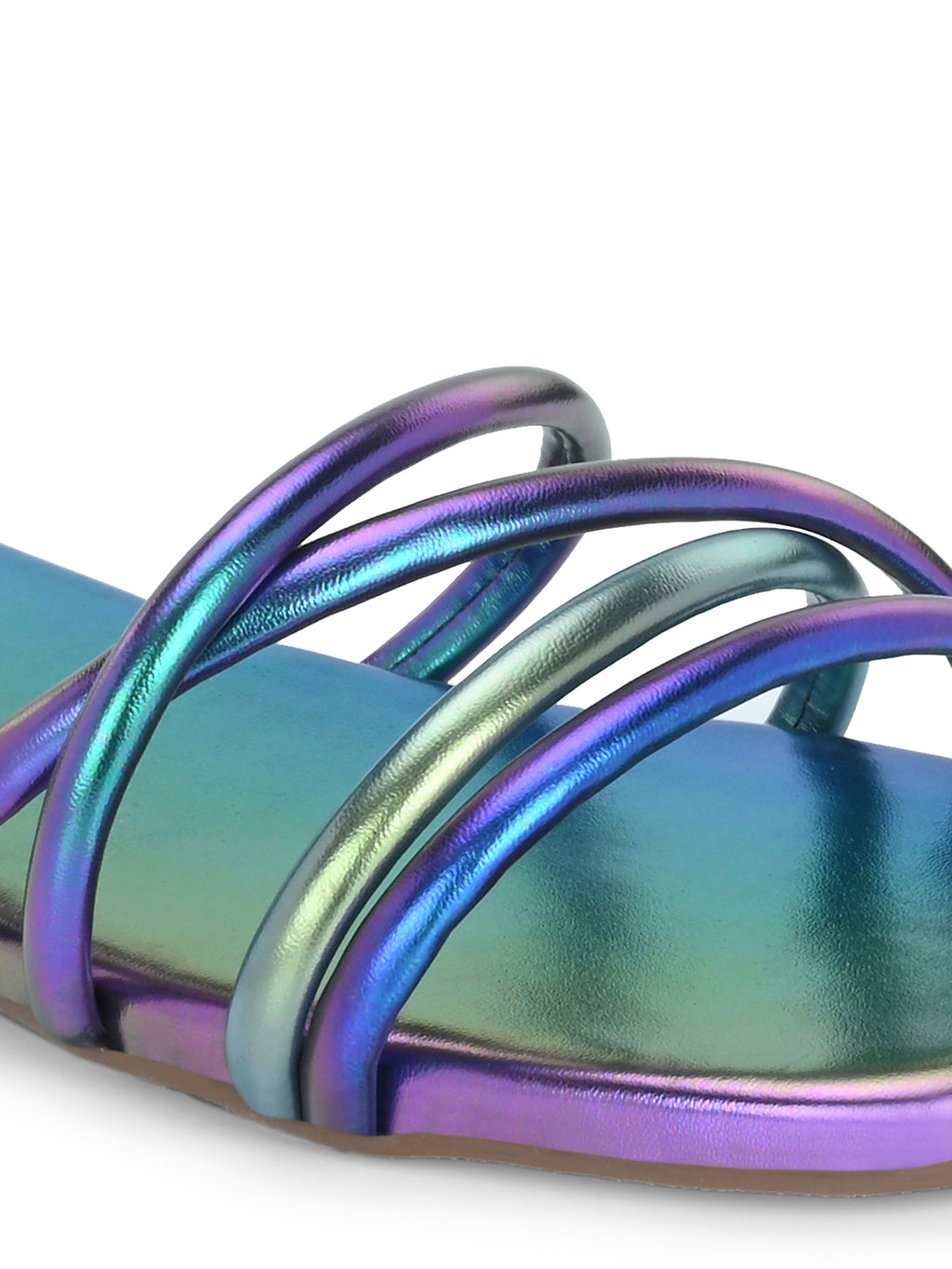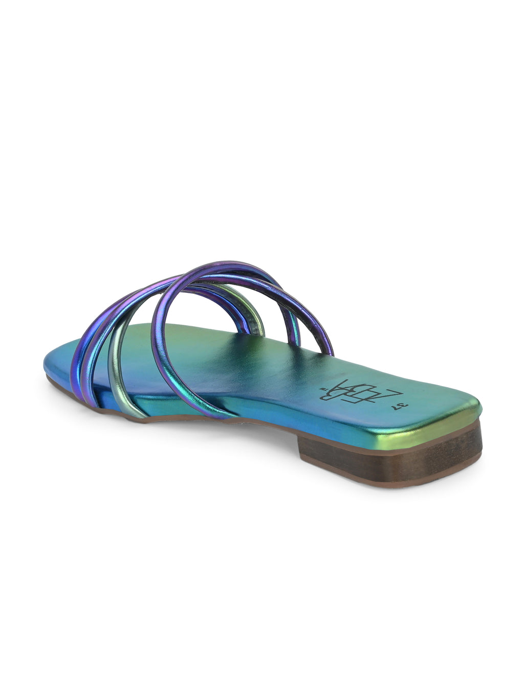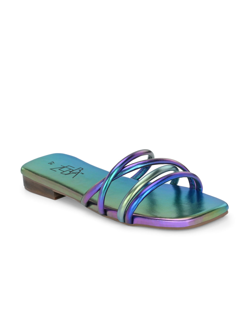 The product is a women's metallic sandal with a square toe and a low heel. It features three shiny, iridescent strap layers that cross over the front in a modern design.