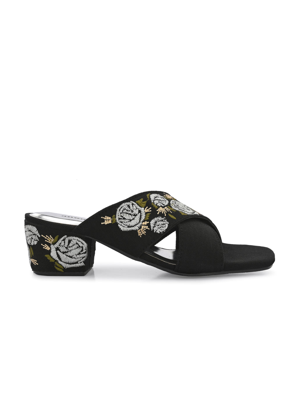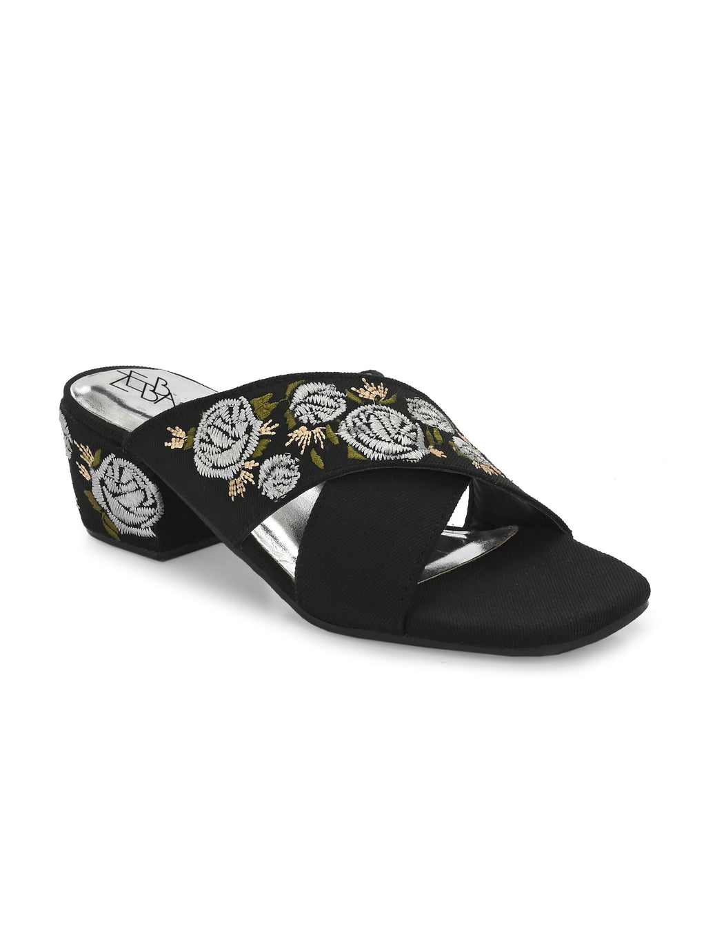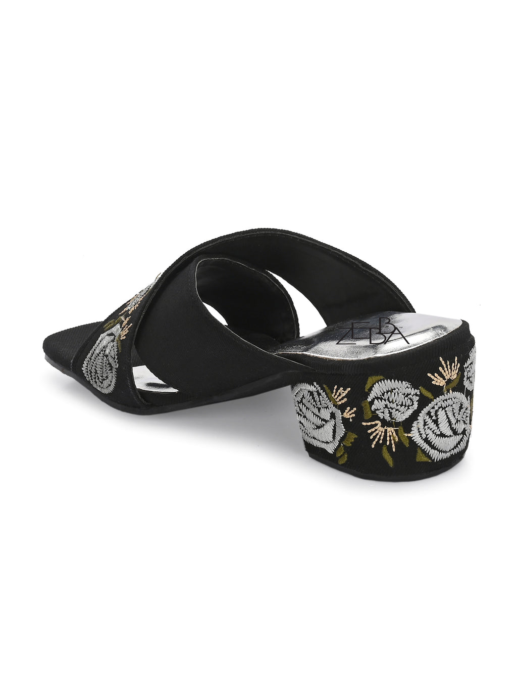 Block heels featuring striking cross strap embroidery .The intricate Silver and white floral patterns provide contrast Luxurious glam against the matt finish.