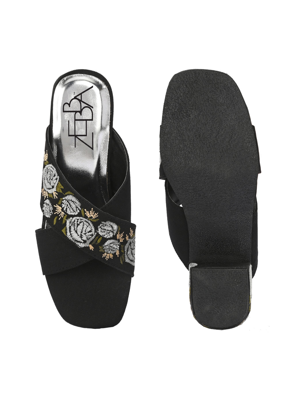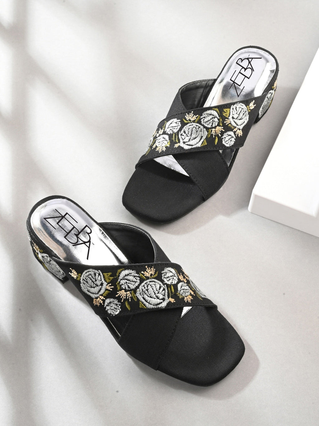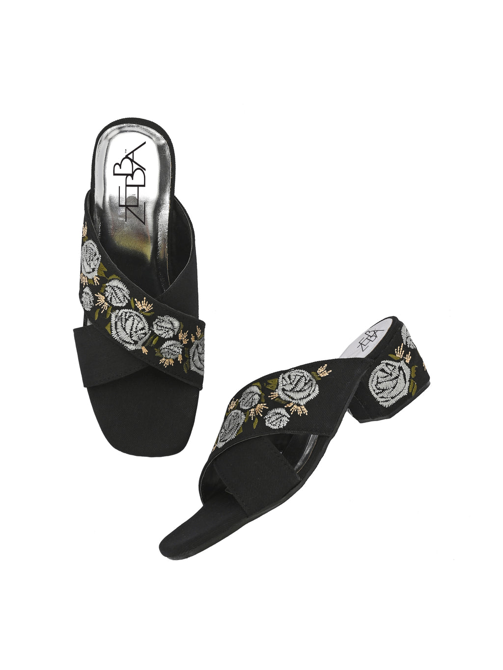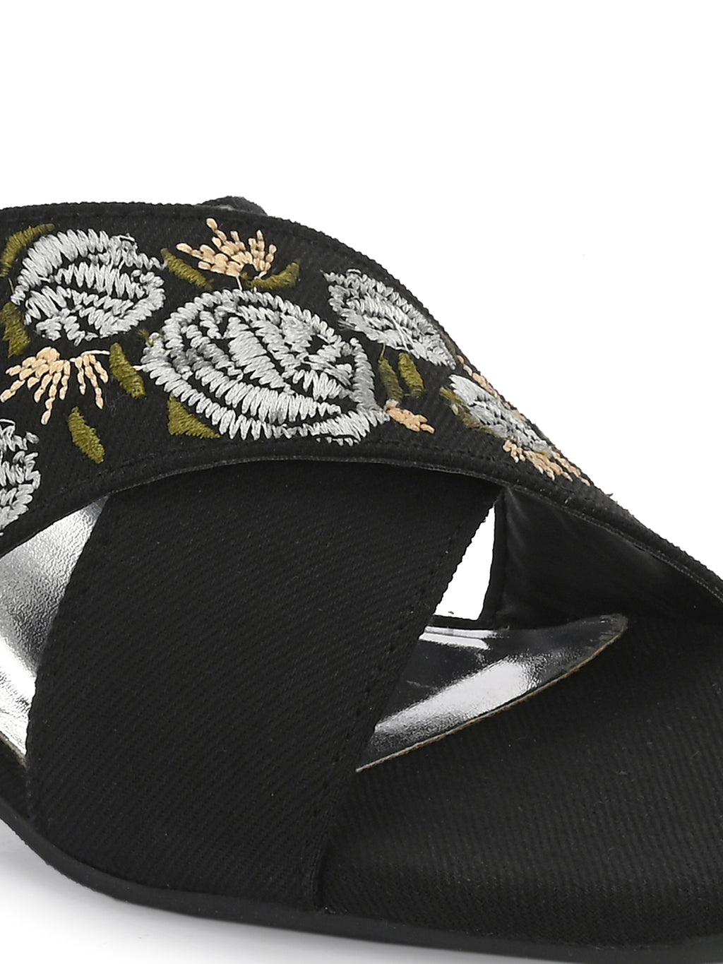 Block heels featuring striking cross strap embroidery .The intricate Silver and white floral patterns provide contrast Luxurious glam against the matt finish.